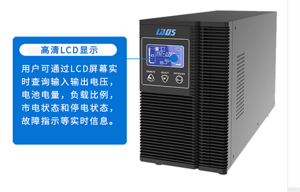 用戶可通過LCD屏幕實時查詢輸入輸出電壓,電池電量,負(fù)載比例,市電狀態(tài)和停電狀態(tài),故障指示等實時信息。